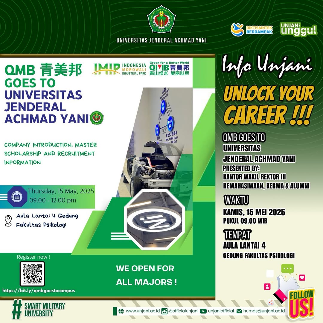 Kabar menarik datang untuk seluruh sivitas akademika Universitas Jenderal Achmad Yani (Unjani)! PT QMB New Energy Material, perusahaan berbasis di Kabupaten Morowali, Sulawesi Tengah, akan hadir secara langsung dalam sesi sosialisasi eksklusif di kampus Unjani. Perusahaan yang menjadi bagian penting dari Kawasan Indonesia Morowali Industrial Park (IMIP) ini akan menggelar acara menarik yang terbuka untuk semua program studi (khusus warga Unjani).