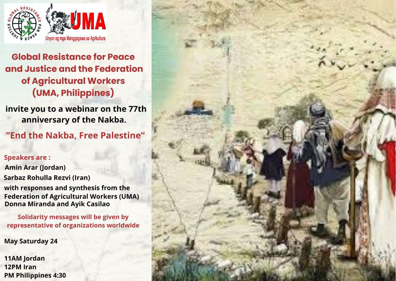 Global Resistance for Peace and Justice and the Federation of Agricultural Workers (UMA, Philippines) invite you to a webinar on the 77th anniversary of the Nakba.