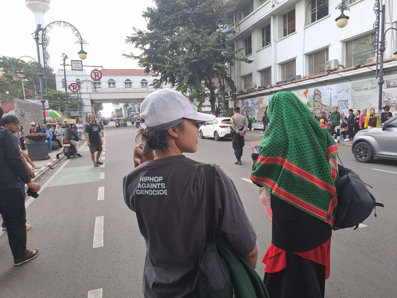Tiba-tiba mata saya menatap pemandangan tak biasa. Seorang gadis muda bergaya urban dengan topi putih, dengan kaos bertuliskan “Hiphop against genocide.” Di sebelahnya ada seorang akhwat bercadar dan berjilbab lebar dengan motif kefiyeh. Seperti dua perempuan dari dunia berbeda. Tapi, mereka berjalan beriringan tanpa canggung.