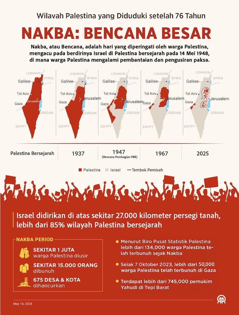 Tanggal 15 Mei 2025 kita peringati sebagai Hari Nakba di Palestina. Hari bencana ketika seluruh warga Palestina yang sedang tidur lelap terbangun dari malam-malam yang tenang. Mereka diusir, dibantai, dan diserang oleh Israel dan harus mengungsi. Sebanyak 15.000 orang dibunuh. Lebih 750.000 orang harus mengungsi dan terusir dari tanah kelahirannya.