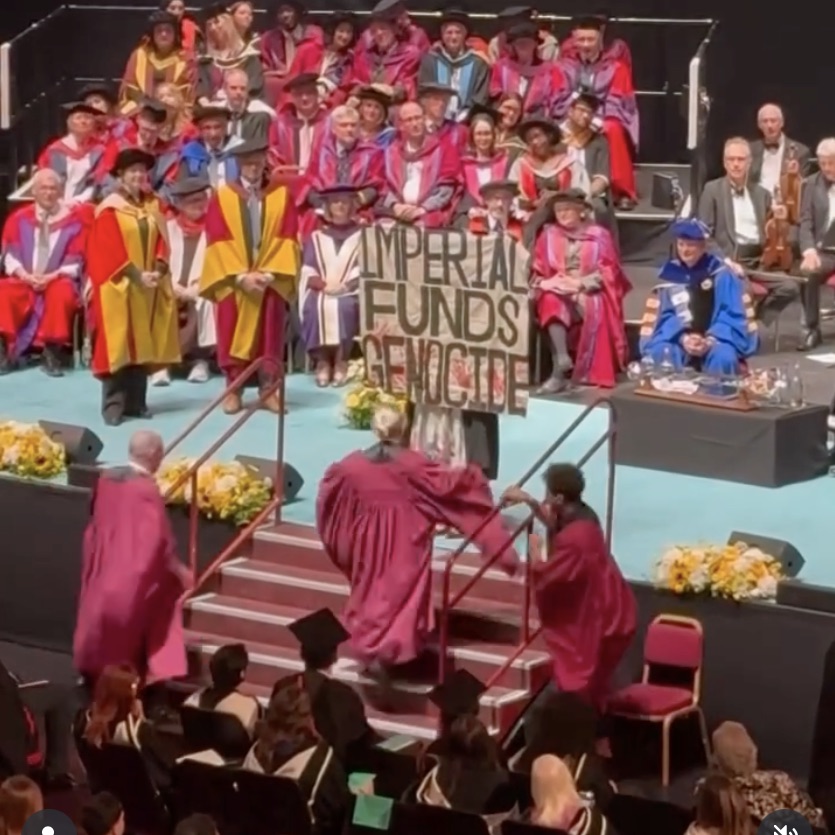 Seorang lulusan Imperial College London dikeluarkan dari upacara wisuda setelah menunjukan tulisan “Imperial mendanai Genosida”, Selasa (3/6). Protes tersebut kemudian viral di media sosial dan menjadi seruan untuk divestasi sebagai tanggapan hubungan finansial Imperial dengan genosida dan pendudukan yang sedang berlangsung oleh Israel terhadap rakyat Palestina. Pihak Imperial menganggap seorang lulusan telah melanggar syarat dan ketentuan wisudawan.