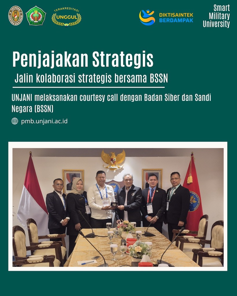Universitas Jenderal Achmad Yani (UNJANI) kembali menunjukkan keseriusannya dalam pengembangan dunia pendidikan dan keamanan siber nasional melalui agenda penting di IndoDefence Expo & Forum 2025 yang berlangsung pada 11–14 Juni 2025. Dalam kegiatan tersebut, UNJANI melaksanakan courtesy call dengan Badan Siber dan Sandi Negara (BSSN) dalam rangka menjajaki kolaborasi strategis di bidang penelitian, pengabdian kepada masyarakat, serta program pertukaran dosen (lecture exchange).