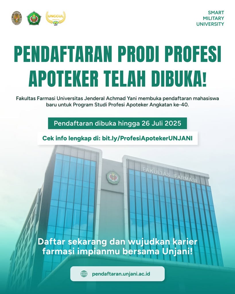 CIMAHI, KabarKampus – Kabar gembira bagi kamu yang bercita-cita menjadi apoteker profesional! Universitas Jenderal Achmad Yani (UNJANI) secara resmi membuka pendaftaran untuk Program Studi Profesi Apoteker mulai tanggal 14 Juli 2025 hingga 26 Juli 2026. Program ini dirancang khusus untuk mencetak lulusan yang tidak hanya kompeten secara akademik, tetapi juga memiliki integritas tinggi serta kesiapan menghadapi tantangan dunia kerja di bidang farmasi.