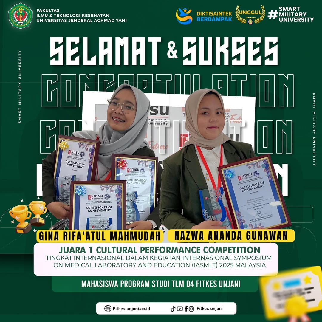 Adalah Gina Rifa, Atul Mahmudah, dan Nazwa Ananda Gunawan, mahasiswi inspiratif dari FITKes UNJANI, yang tergabung dalam Tim Cultural Performance dan menampilkan pertunjukan seni budaya Indonesia yang memukau. Kompetisi ini merupakan bagian dari simposium bergengsi yang diselenggarakan oleh Management and Science University (MSU) Malaysia bekerja sama dengan AIPTLMI (Asosiasi Institusi Pendidikan Tinggi Laboratorium Medik Indonesia), dan diikuti oleh berbagai peserta dari Asia Tenggara.