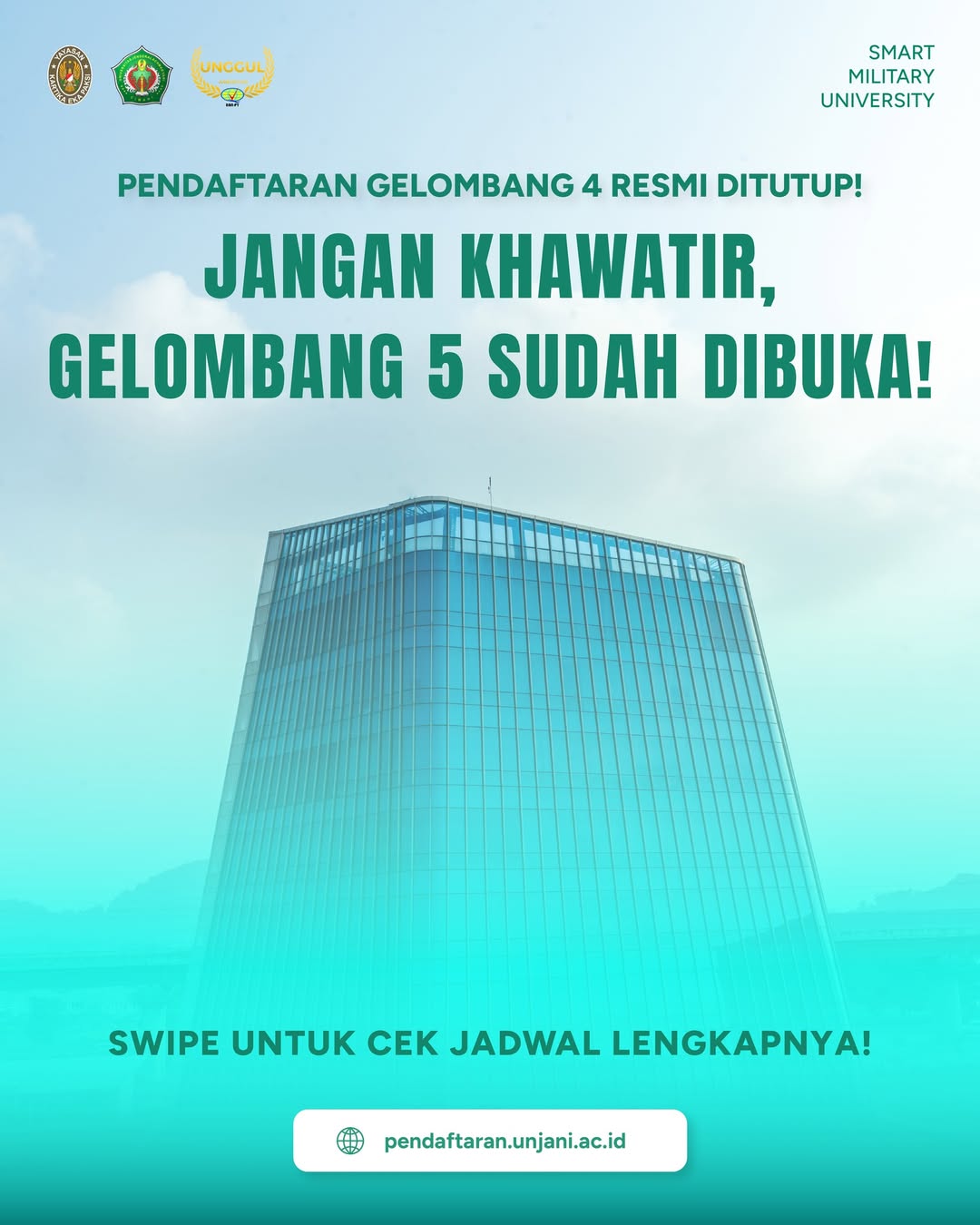 CIMAHI, KabarKampus – Universitas Jenderal Achmad Yani (UNJANI) kembali membuka kesempatan emas bagi para calon mahasiswa baru melalui Pendaftaran Gelombang 5 yang resmi dimulai pada 13 Juli 2025. Gelombang ini merupakan tahap penting dalam proses penerimaan mahasiswa baru tahun akademik 2025/2026 dan mencakup berbagai jalur seleksi yang fleksibel dan ramah bagi Gen Z.