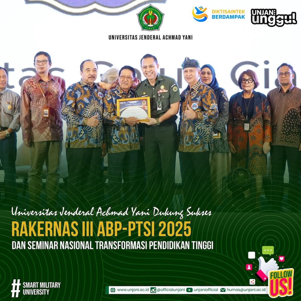 CIMAHI, KabarKAMPUS – Universitas Jenderal Achmad Yani (Unjani) kembali menunjukkan eksistensinya sebagai institusi pendidikan tinggi yang progresif dan kolaboratif. Kali ini, Unjani turut serta dalam mendukung suksesnya pelaksanaan Rapat Kerja Nasional (Rakernas) III Asosiasi Badan Penyelenggara Perguruan Tinggi Swasta Indonesia (ABP-PTSI) Tahun 2025 dan Seminar Nasional bertema “Implementasi Perubahan Paradigma dan Transformasi Tata Kelola Pendidikan Tinggi”. Kegiatan ini berlangsung pada 16–17 Juli 2025 di Grand Ballroom Pullman Hotel Bandung, dan menjadi ajang penting bagi perguruan tinggi swasta se-Indonesia untuk menyatukan visi ke depan.