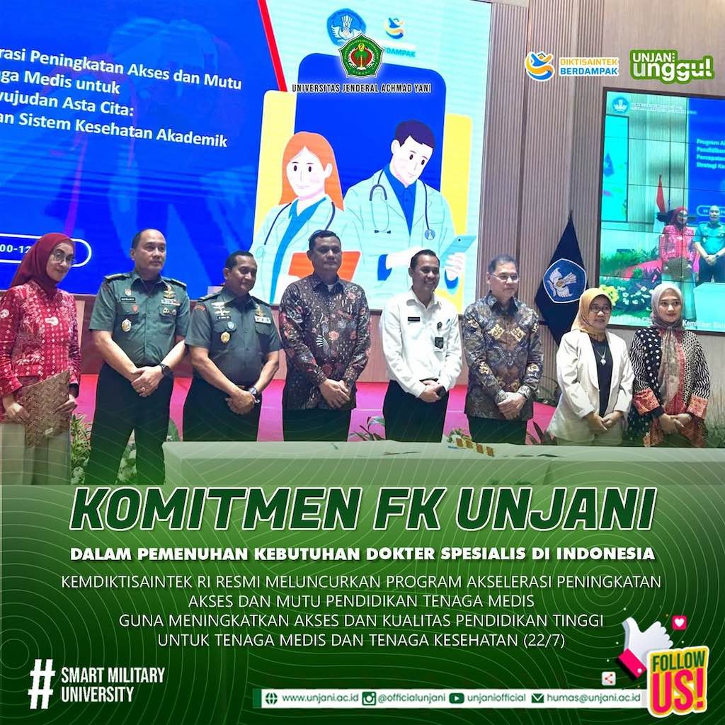 Fakultas Kedokteran Universitas Jenderal Achmad Yani (FK UNJANI) menegaskan komitmennya dalam mempercepat pemerataan dan peningkatan mutu pendidikan tenaga medis di Indonesia. Hal ini ditandai dengan keikutsertaan FK UNJANI dalam peluncuran Program Akselerasi Peningkatan Akses dan Mutu Pendidikan Tenaga Medis yang diinisiasi oleh Kementerian Pendidikan Tinggi dan Riset Teknologi (Kemdiktisaintek RI) pada Selasa, 22 Juli 2025 di Auditorium Kemdiktisaintek, Jakarta.