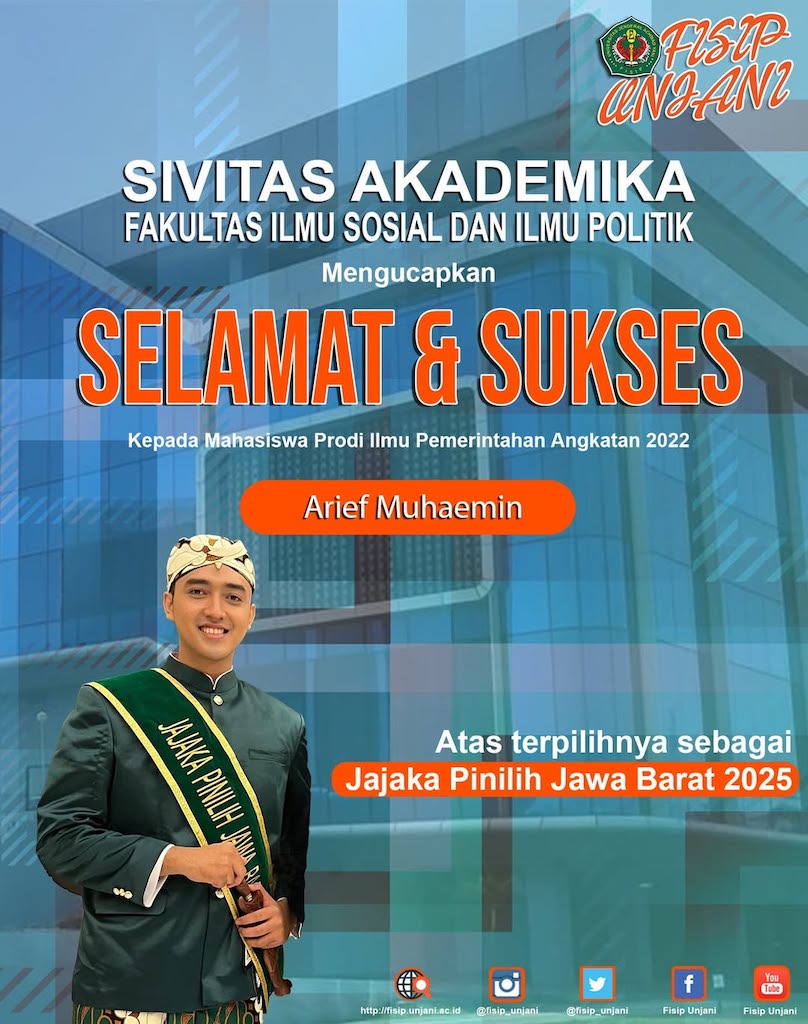 CIMAHI, KabarKampus – Kabar membanggakan datang dari Fakultas Ilmu Sosial dan Ilmu Politik (FISIP) Universitas Jenderal Achmad Yani (UNJANI). Arief Muhaemin, mahasiswa Program Studi Ilmu Pemerintahan angkatan 2022, berhasil meraih predikat Jajaka Pinilih Jawa Barat 2025 dalam ajang pemilihan Mojang Jajaka yang digelar pada Juli 2025. Prestasi ini menjadi bukti bahwa mahasiswa UNJANI tak hanya unggul di bidang akademik, tetapi juga aktif dalam kegiatan budaya dan pengembangan diri.