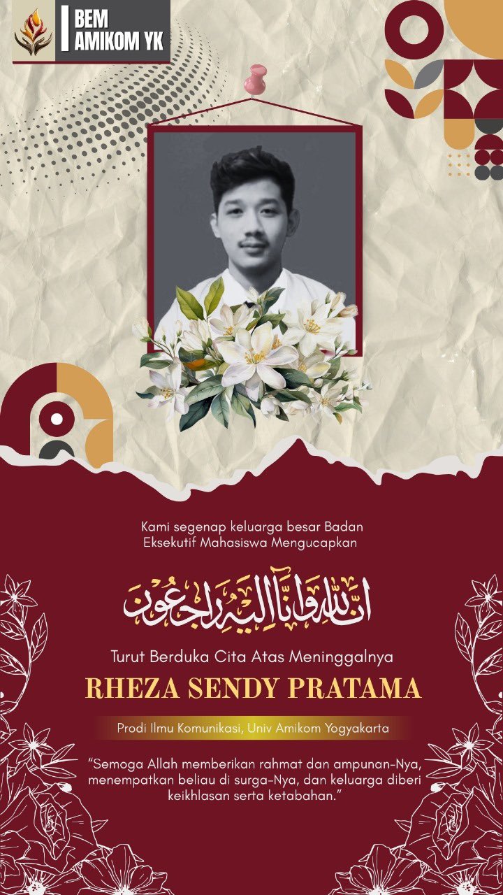 Universitas Amikom Yogyakarta menyampaikan belasungkawa melalui akun Instagram resminya, @amikomjogja, “Innalillahi wa inna ilaihi raji’un. Kami segenap keluarga besar Universitas Amikom Yogyakarta menyampaikan duka cita yang mendalam atas berpulangnya: Rheza Sendy Pratama (Mahasiswa Prodi S1 Ilmu Komunikasi, Angkatan 2023). Semoga Allah SWT menerima amal ibadah almarhum, menempatkannya di tempat terbaik di sisi-Nya, serta memberikan ketabahan dan keikhlasan bagi keluarga yang ditinggalkan.”