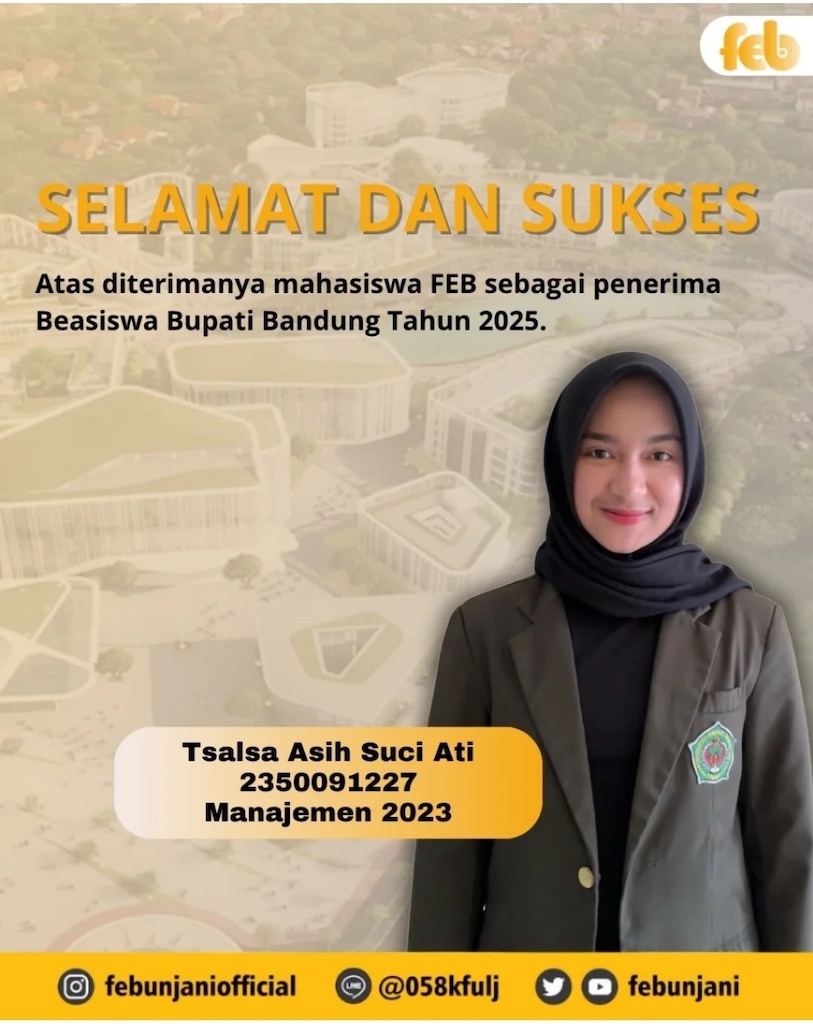 CIMAHI, KabarKampus – Fakultas Ekonomi dan Bisnis (FEB) Universitas Jenderal Achmad Yani (UNJANI) kembali menorehkan prestasi membanggakan. Kali ini, kabar gembira datang dari Tsalsa Asih Suci Ati, mahasiswi Program Studi Manajemen angkatan 2023, yang berhasil meraih Beasiswa Bupati Bandung Tahun 2025. Pengumuman resmi beasiswa ini dilakukan pada Juli 2025 dan disambut penuh rasa syukur oleh seluruh civitas akademika UNJANI, khususnya keluarga besar FEB.