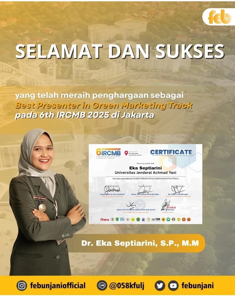 CIMAHI, KabarKampus – Fakultas Ekonomi dan Bisnis Universitas Jenderal Achmad Yani (FEB UNJANI) kembali mengukir prestasi membanggakan di kancah internasional. Pada 6th International Research Conference on Management and Business (IRCMB) 2025 yang digelar di Jakarta, 26–27 Juli 2025 yang lalu, dosen dan mahasiswa FEB UNJANI berhasil meraih penghargaan sebagai Best Presenter di beberapa kategori penting. Prestasi ini semakin mengukuhkan posisi UNJANI sebagai kampus yang konsisten melahirkan akademisi muda berdaya saing global.