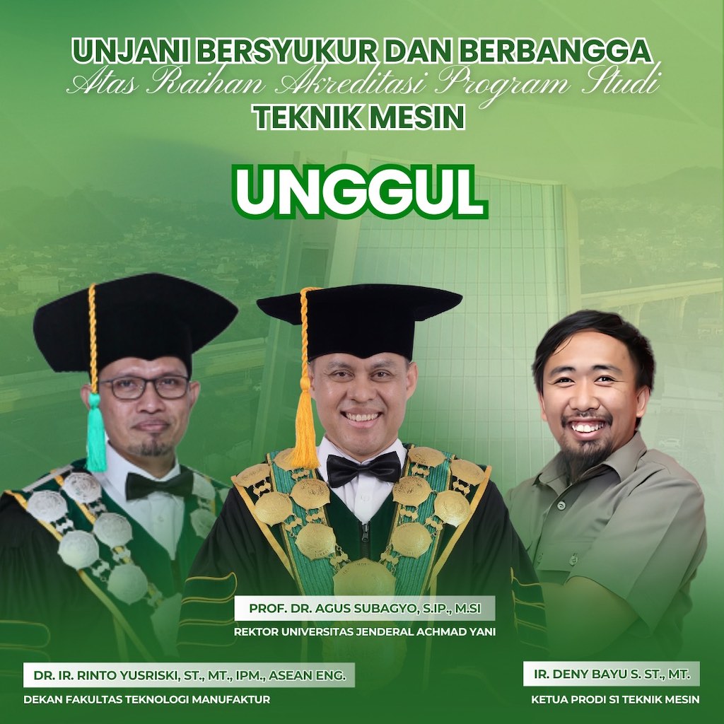 CIMAHI, KabarKampus – Universitas Jenderal Achmad Yani (UNJANI) kembali menorehkan prestasi gemilang. Dengan penuh rasa syukur, kami umumkan bahwa Program Studi Sarjana Teknik Mesin, Fakultas Teknologi Manufaktur UNJANI resmi meraih Akreditasi Unggul berdasarkan Keputusan LAM Teknik No. 0677/SK/LAM Teknik/AS/VIII/2025 pada Agustus 2025. Pencapaian ini menjadi bukti nyata atas dedikasi dan kerja keras seluruh civitas akademika dalam menjaga mutu pendidikan.