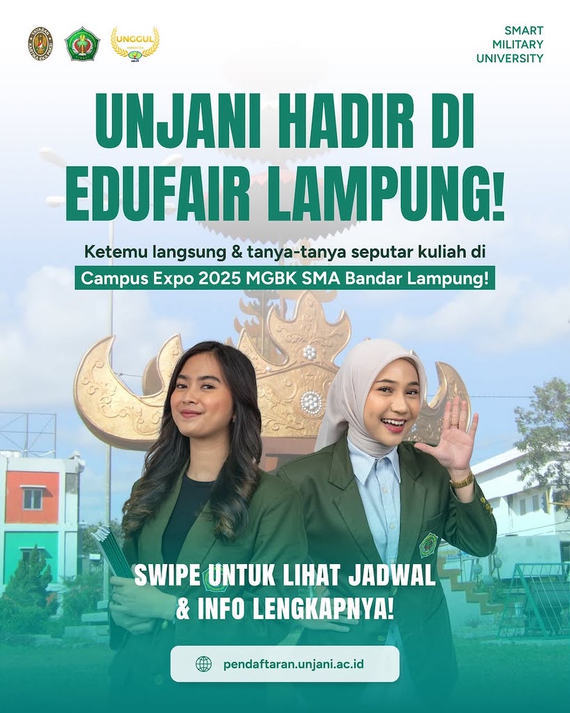 Hai, adik-adik Gen Z di Bandar Lampung dan sekitarnya! Universitas Jenderal Achmad Yani (UNJANI) siap hadir lebih dekat dengan kalian semua dalam event Edufair Campus Expo 2025 yang diselenggarakan oleh MGBK SMA Bandar Lampung. Catat tanggalnya: 7–8 Agustus 2025, bertempat di Ballroom Hotel Horison, Bandar Lampung. Ini jadi momen spesial buat kamu yang penasaran dan pengin tahu lebih jauh tentang kehidupan kampus, jurusan-jurusan kece, serta peluang berkuliah di UNJANI.