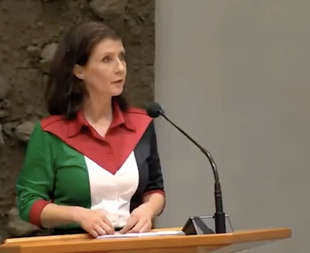 Anggota parlemen Belanda, Esther Ouwehand, diminta mengganti pakaiannya setelah menghadiri debat anggaran negara dengan mengenakan busana bermotif bendera Palestina, Kamis (18/9). Ketua Parlemen, Martin Bosma, menghentikan pidatonya dan menyebut bahwa tindakan tersebut dianggap “menyinggung,” sebelum memintanya untuk mengganti pakaian dan kembali ke ruang sidang.