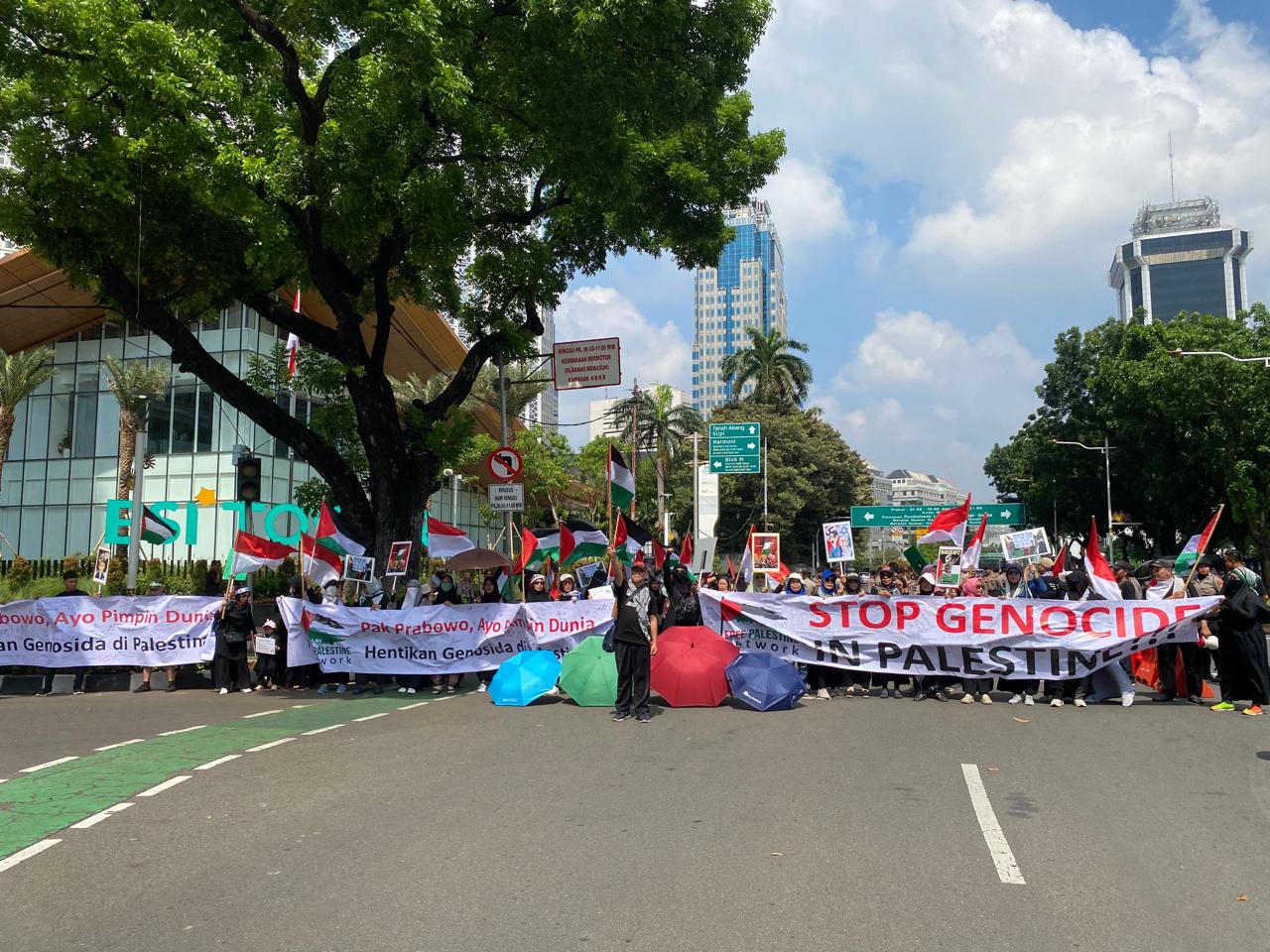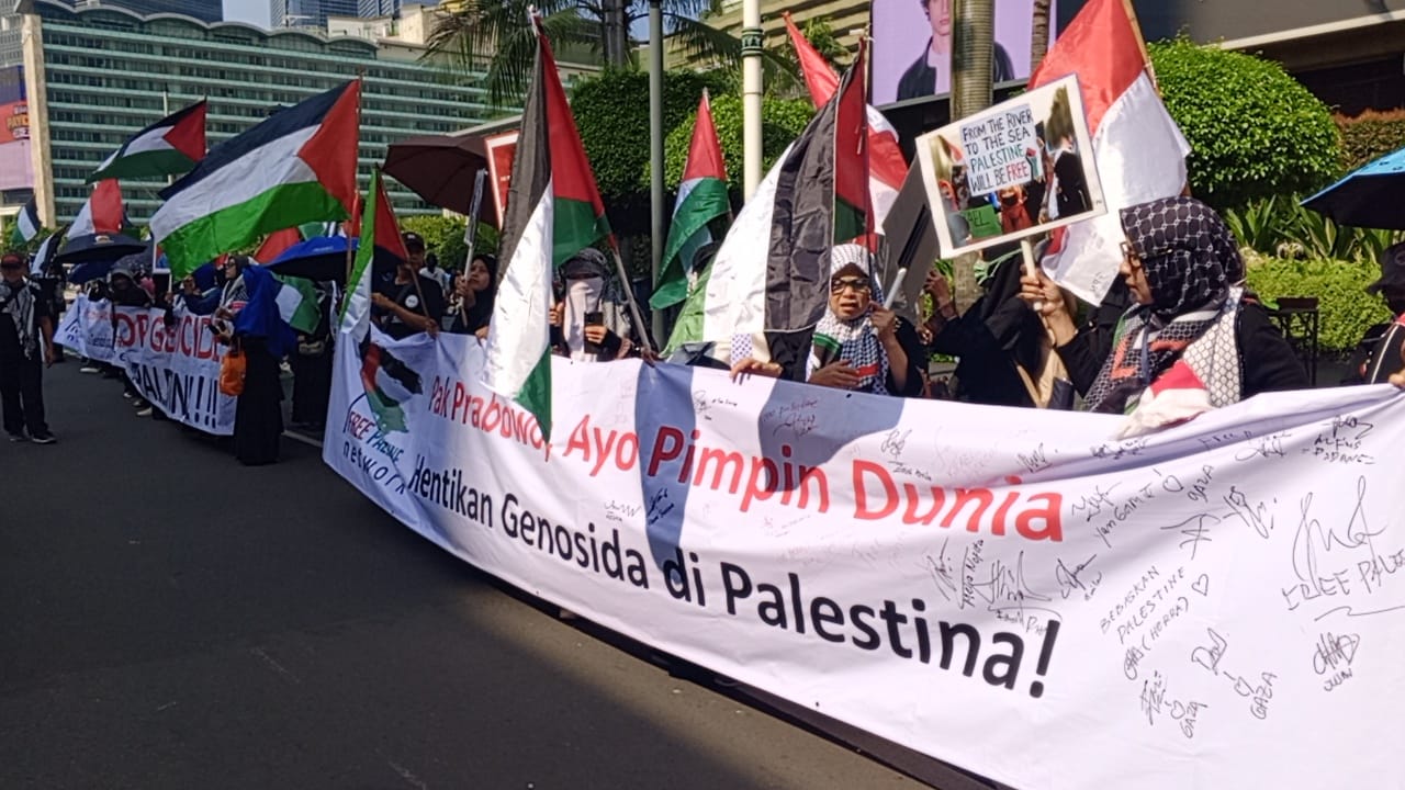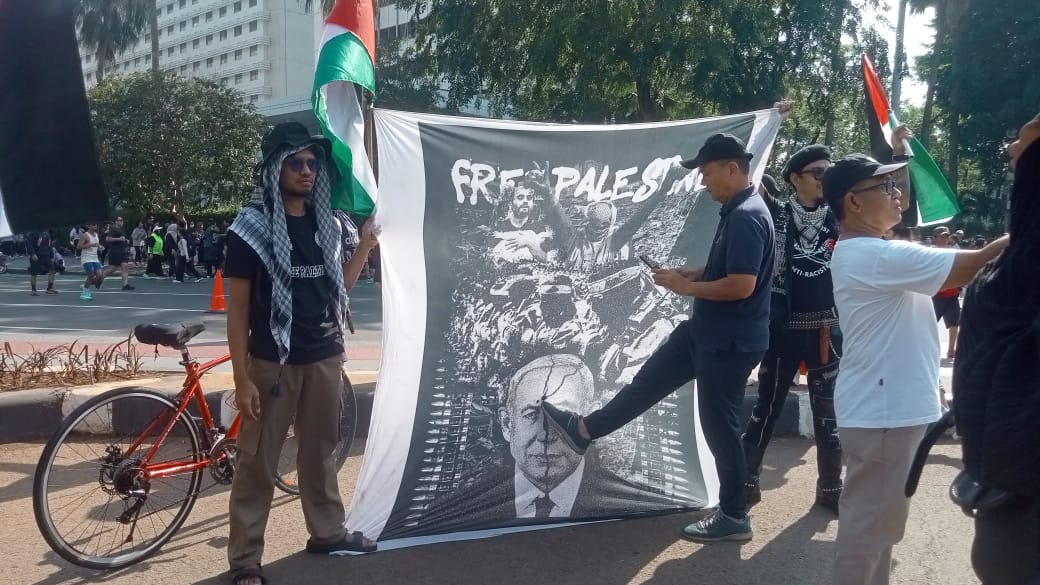 Seorang warga berfoto dengan gaya menendang kepala Netanyahu di spanduk pada aksi simpatik Free Palestine Network (FPN) di Bundaran HI Jakarta saat Car Free Day (21/9).Massa aksi FPN bersiap pawai menuju Istana Presiden setelah berorasi dan mengumpulkan tanda tangan publik di Bundaran HI Jakarta saat Car Free Day (21/9)Massa aksi Free Palestine Network (FPN) dihadang aparat di Silang Monas Merdeka Selatan saat pawai menuju Istana Merdeka menyuarakan aspirasi untuk Prersiden Prabowo memimpin dunia menghentikan genosida di Palestina (21/9). Menurut Sekjen FPN, Furqan AMC, kesempatan pidato Presiden Prabowo tanggal 23 September 2025 adalah momentum strategis untuk mengambil kepelopran kepemimpinan di dunia untuk menghentikan genosida di Palestina.Indonesia punya modal sejarah menginspirasi lebih 40 negara merdeka dari kolonialisme/imperialisme pasca konferensi Asia Afrika. Begitu juga ketika menginisiasi dan memimpin Gerakan Non Blok GNB), Indonesia telah menyelamatkan dunia dari ancaman perang dunia ketiga.