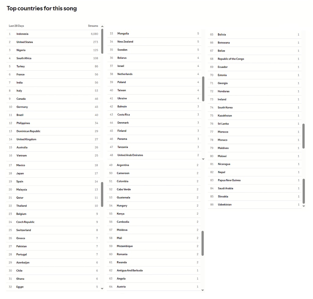 Dominasi pendengar Indonesia (87%), dengan pertumbuhan cepat di Nigeria, Turki, Afrika Selatan, AS, Prancis, India, dan Jerman.