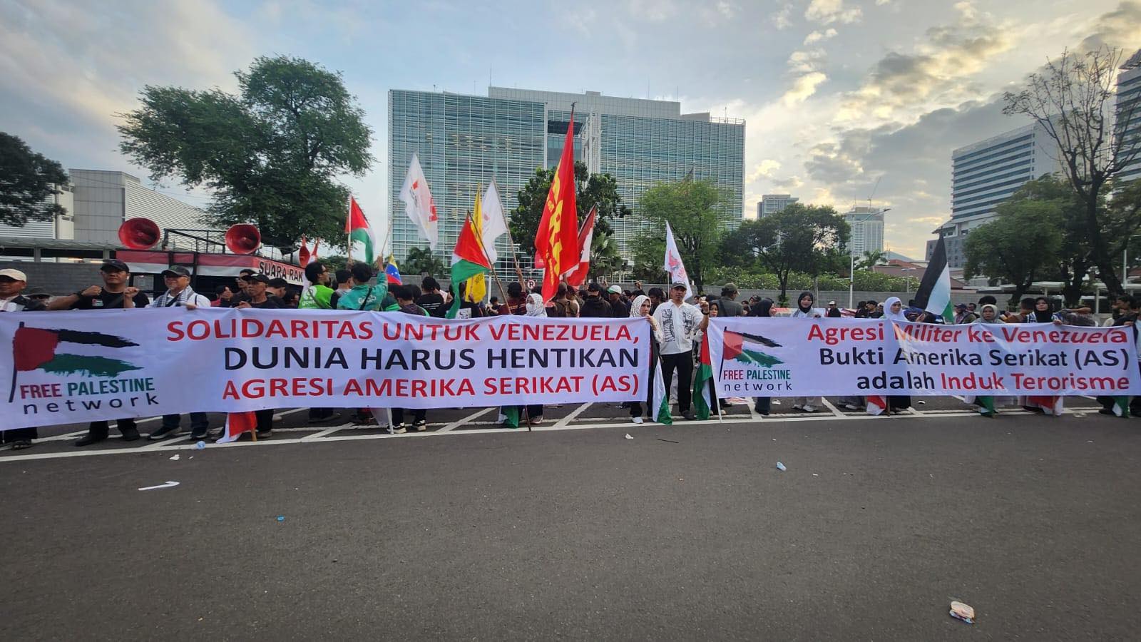 JAKARTA, KabarKampus – Massa Free Palestine Network (FPN) menggelar aksi solidaritas terhadap Venezuela di depan Kedutaan Besar Amerika Serikat (AS), di jalan Merdeka Selatan, Jakarta Pusat, Selasa (6/1/2026). Tampak massa FPN membentangkan dua spanduk besar.