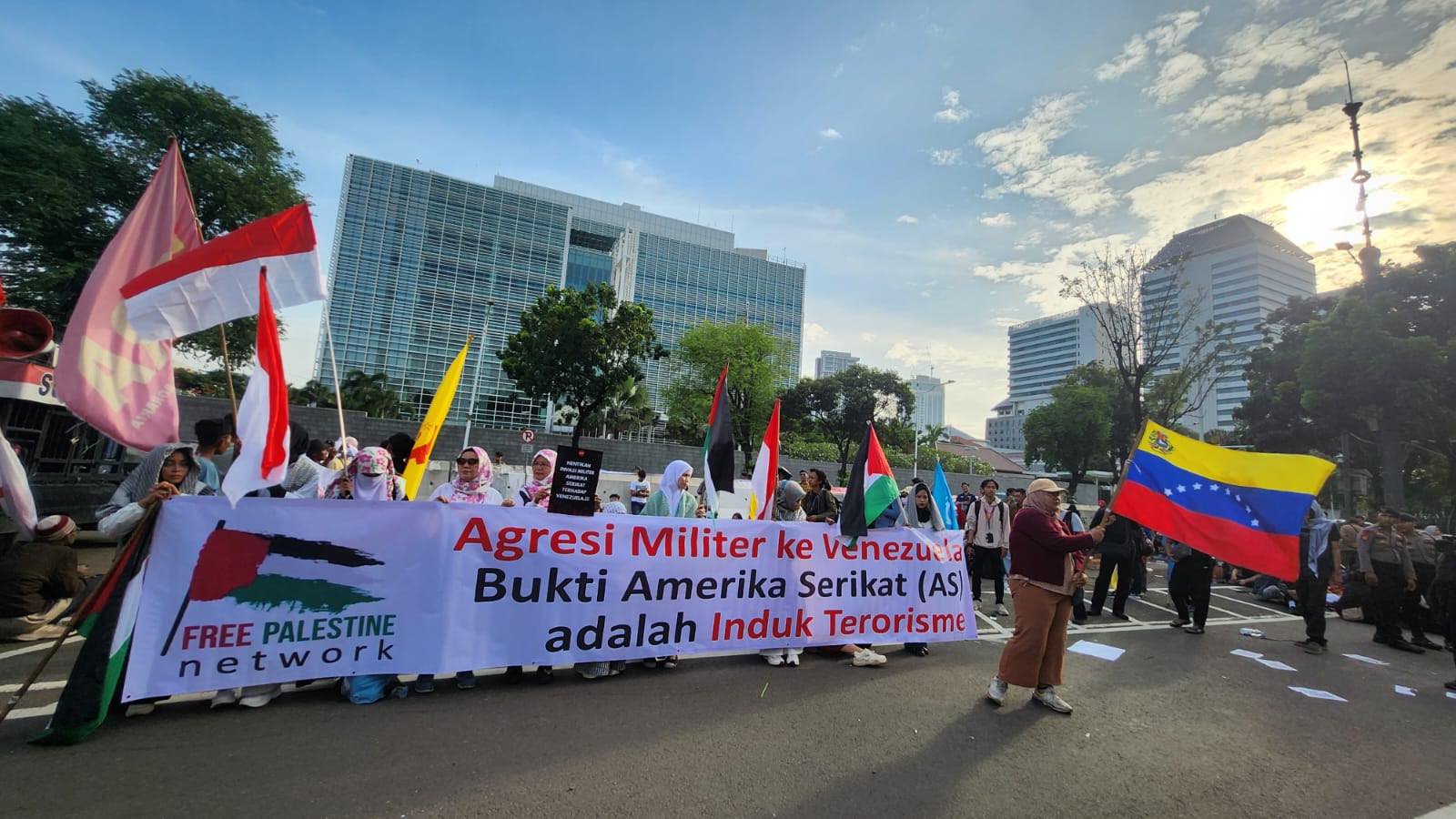 Menurut Furqan, aksi yang juga dilakukan FPN serentak hari ini di Bandung, Makassar, Solo, Kendari, Tarakan, Majene, dan berbagai kota lainnya di seluruh Indonesia adalah mata rantai perlawanan yang sama dengan perjuangan kaum buruh, kaum tani, mahasiswa dan pelajar yang ikut bersolidaritas untuk Venezuela di depan kedubes AS.